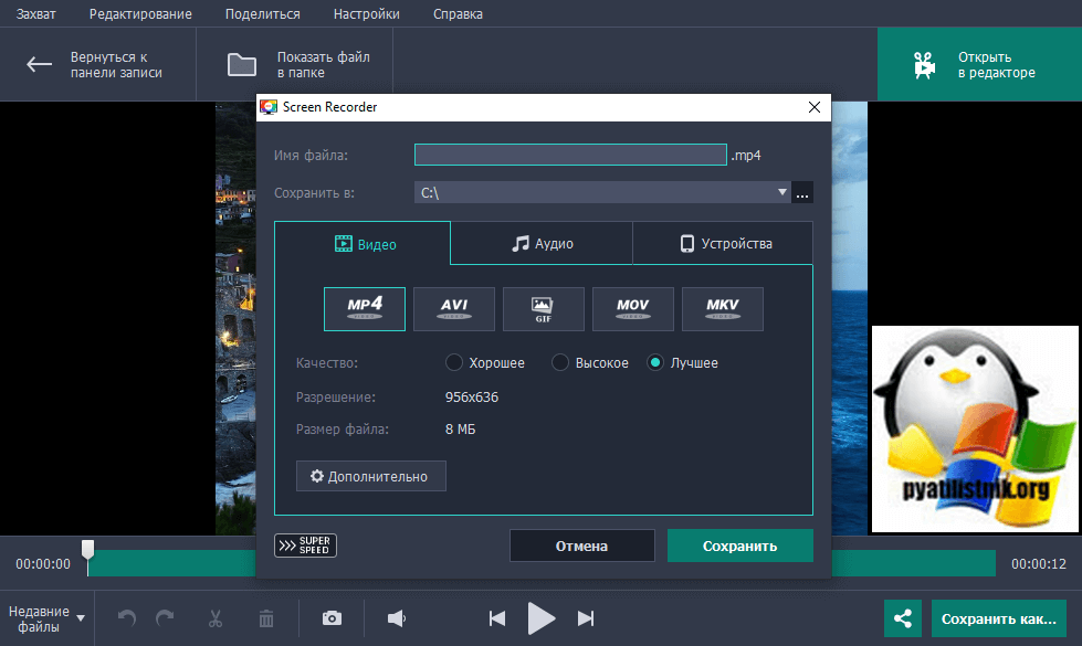 Для начала записи жмём REC, после окончания (если вы успели до срабатывания таймера) жмём стоп, и сохраняем в нужном месте в нужном формате. Здесь также после окончания записи вы можете просмотреть ролик, сделать необходимые правки.