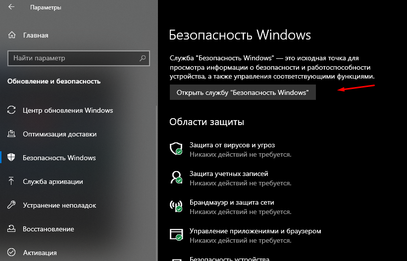 - Нажмите на кнопку «Открыть службу безопасности Windows».