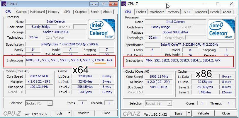 x64 укажет на 64-разрядный ЦП, а x86 — на старый 32-битный. В CPU-Z на 64-разрядный ЦП укажут маркеры х86-64 или ЕМ64Т в блоке «Instructions», если процессор окажется 32-битным, указанные маркеры будут отсутствовать.
