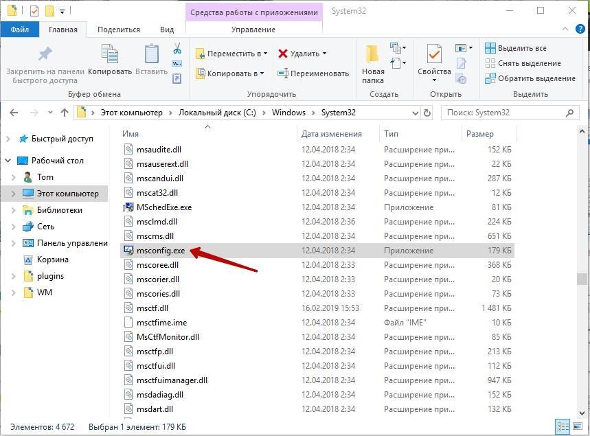 - Через «Проводник» или любой другой файловый менеджер открываем папку C:WindowsSystem32.В «Проводнике» открываем папку C:WindowsSystem32 и запускаем файл msconfig.exe