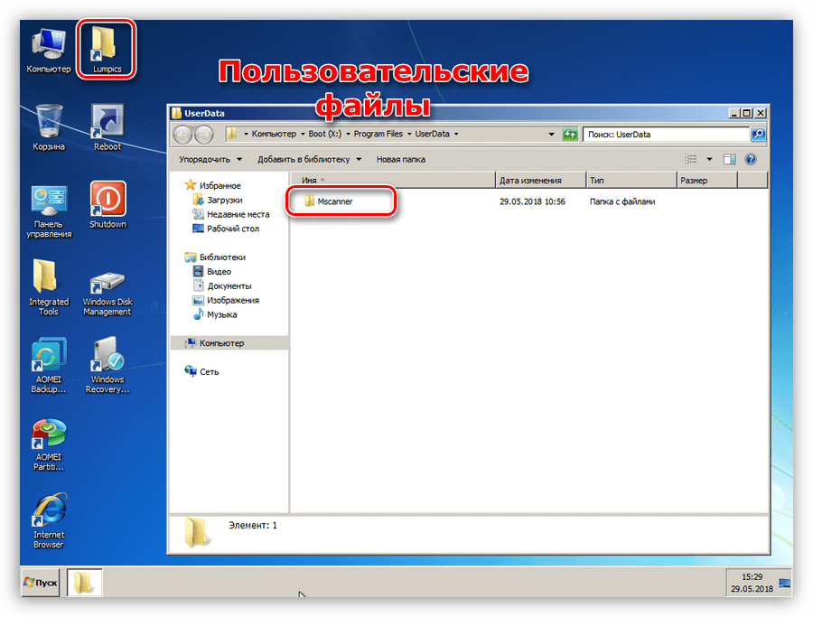 Запуск Windows PE производится точно так же, как и Windows To Go. При загрузке с такой флешки мы увидим привычный рабочий стол (в «десятке» внешний вид может отличаться) с расположенными на нем ярлыками программ и утилит, а также с папкой, содержащей наши файлы. В этой среде можно работать с дисками, выполнять резервное копирование и восстановление, изменять доступные настройки в «Панели управления» и многое другое.