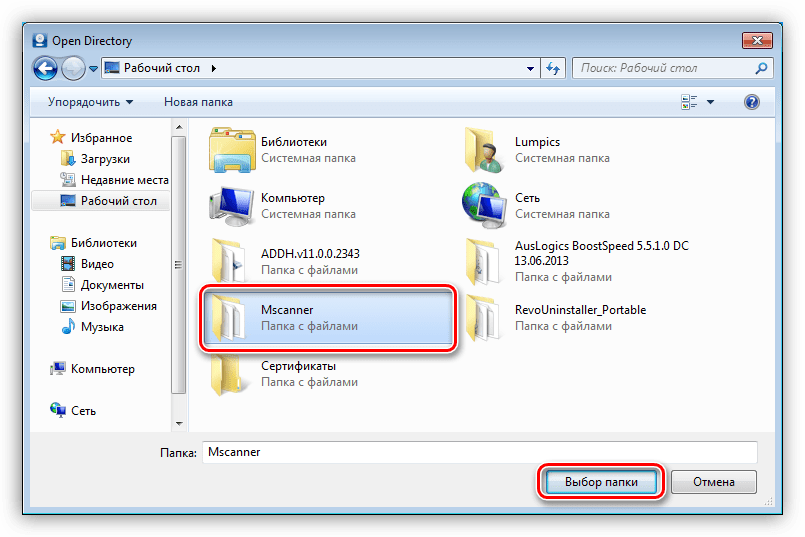 Ищем папку (файл) на диске и жмем «Выбор папки».