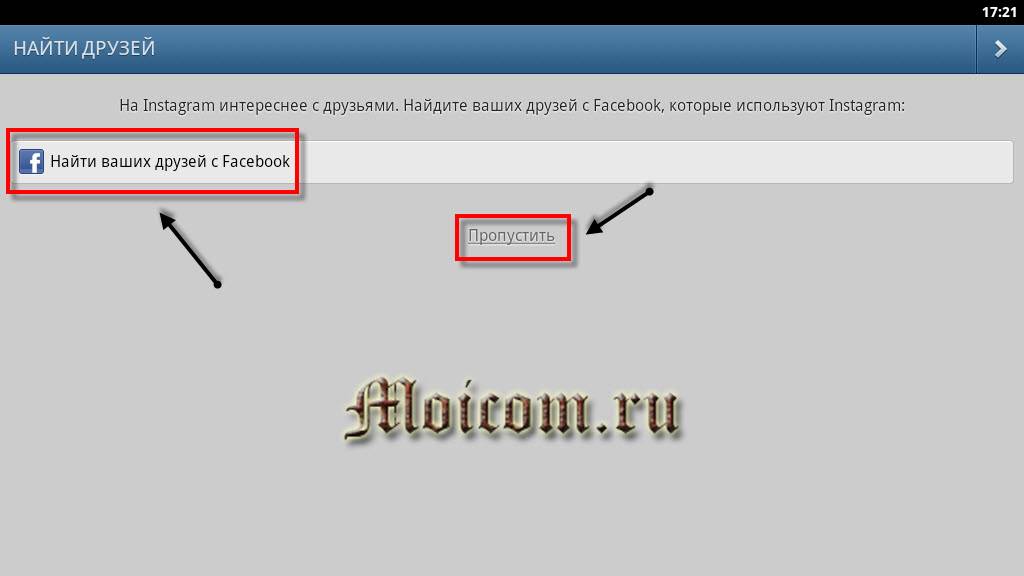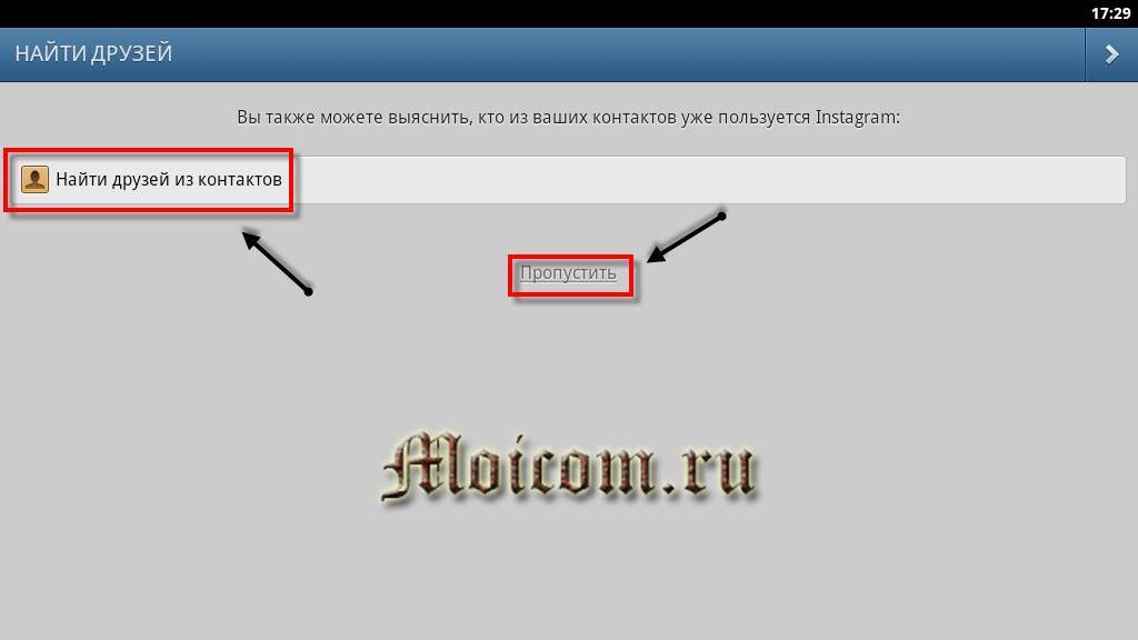 Далее нам предлагают найти наших друзей из социальной сети , которые уже есть и пользуются Instagram. Можно нажать найти друзей или отказаться и пропустить этот шаг.