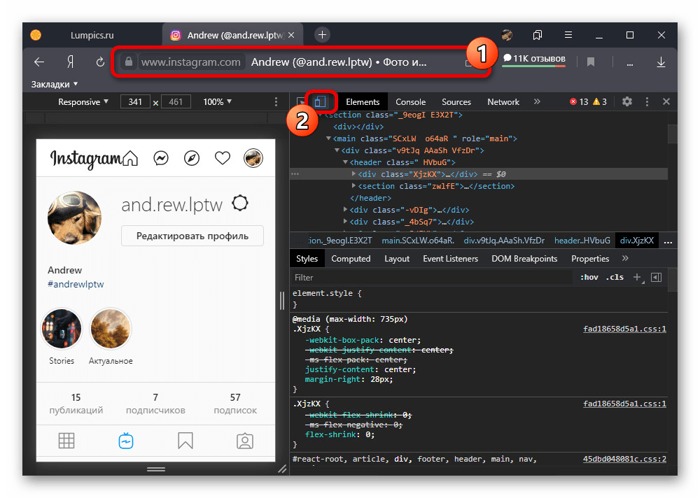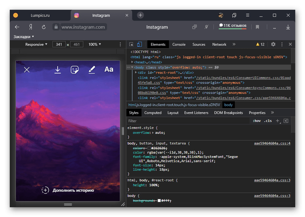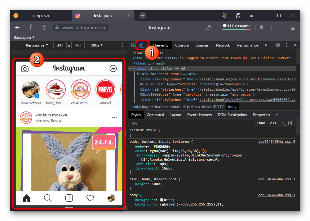 В любом интернет-браузере на компьютере можно прибегнуть ко встроенному эмулятору, позволяющему использовать полноценную мобильную версию веб-сайта. Это особенно полезно в случае с Instagram, так как становятся доступны, хоть и в ограниченном виде, инструменты для публикации фотографий, видеозаписей и сторис.