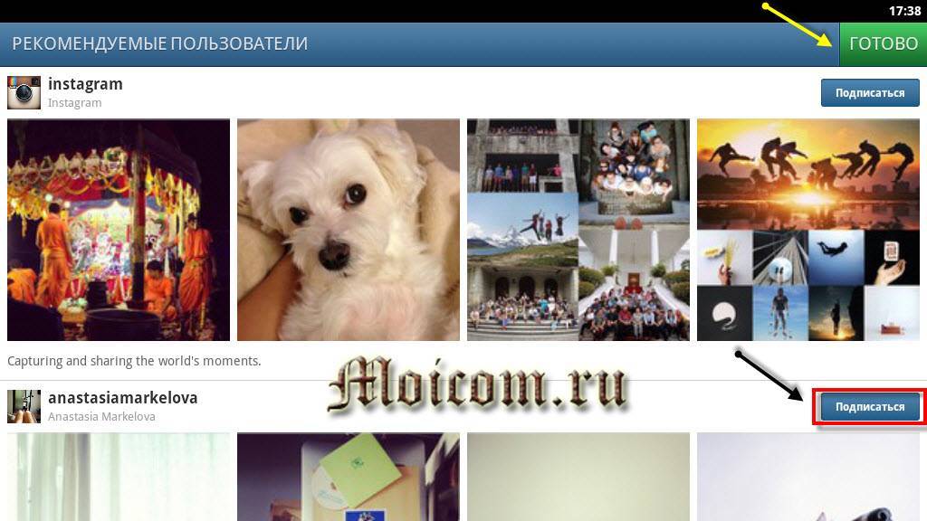Ну вот, регистрация в Инстаграм наконец-то завершена, вверху, справа в углу под временем появилась надпись готово. Можете подписаться на предложенных пользователей, которые вам понравились.