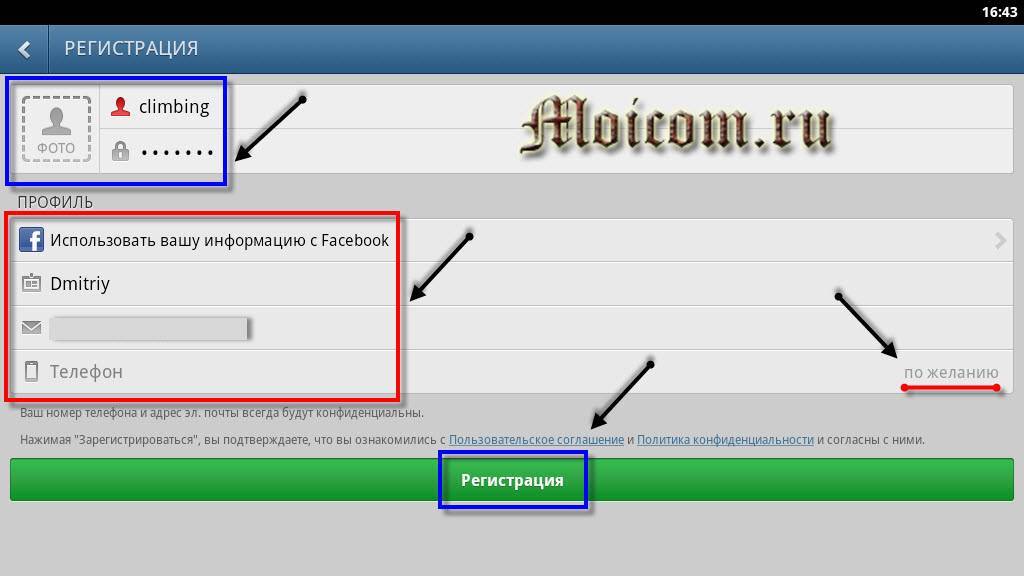 Необходимо добавить фотографию, указать имя пользователя, пароль, электронную почту и номер телефона (не обязательно, по желанию). Так же можно подключить ваш профиль на Facebooke. Кстати, если у вас еще нет электронного почтового ящика, то можете его завести на Mail.ru, Gmail, Яндекс почте, и других.