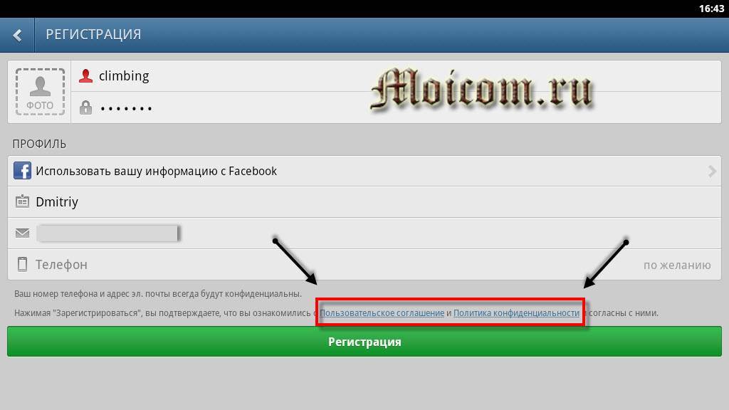 Если вы хотите прочитать Пользовательское соглашение и познакомиться с Политикой конфиденциальности, то можете перейти по соответствующим, еле заметным синим ссылкам.