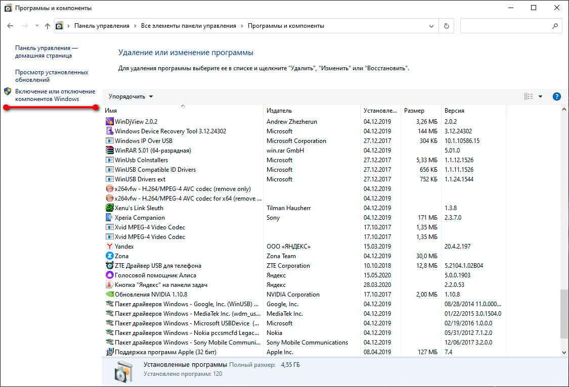 В этой настройке Вам нужно выбрать «Включить или отключить компоненты Windows»…