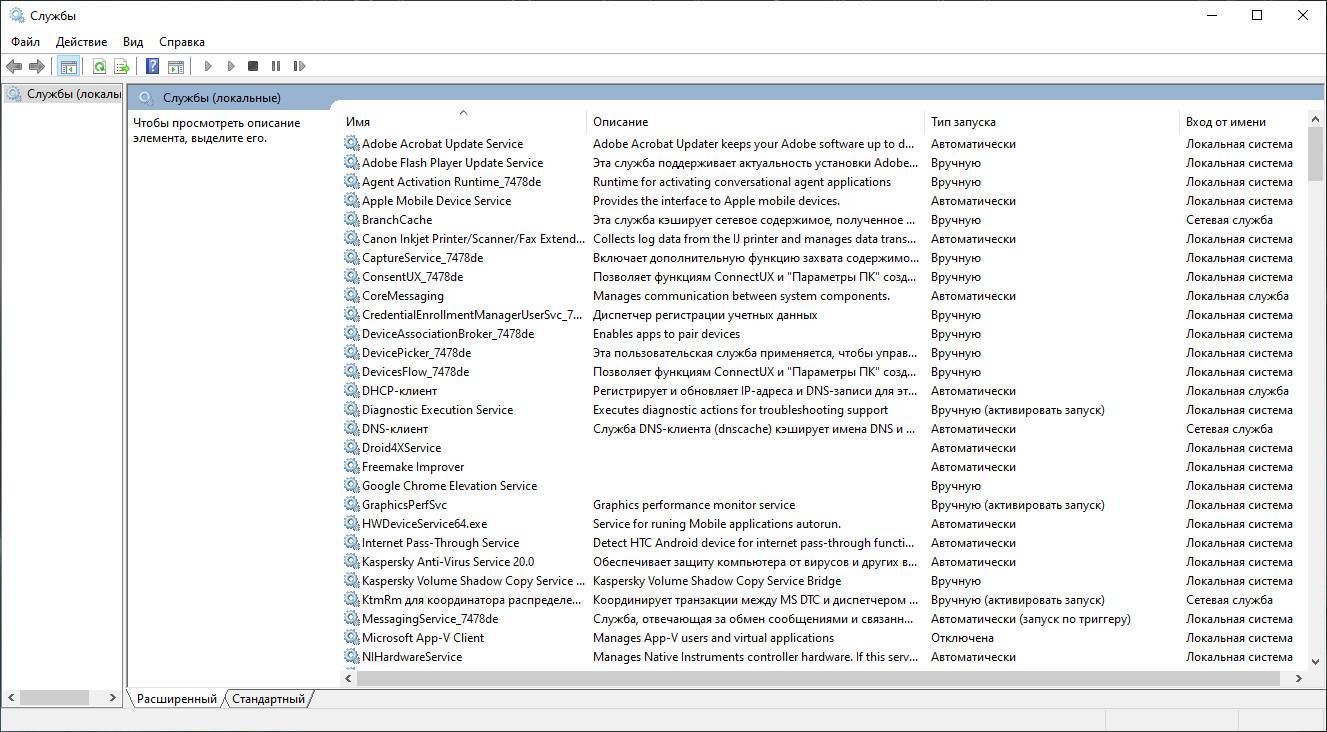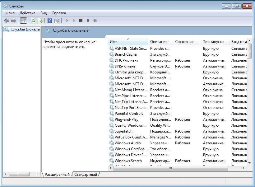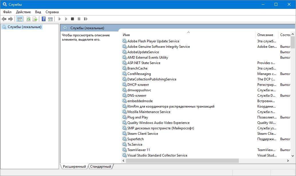 Менеджер отображает службы в виде таблицы. Здесь можно просмотреть список доступных служб, прочитать их краткое описание и узнать текущий статус