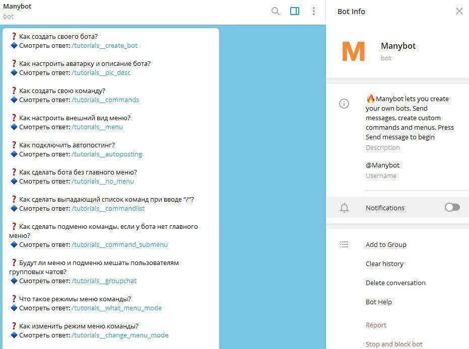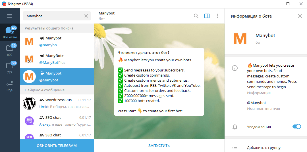 - В той ситуации, когда вы не имеете нужных знаний в области программирования, то на помощь придет универсальный конструктор, чтобы создать бота для Telegram. Мы будем использовать Manybot.