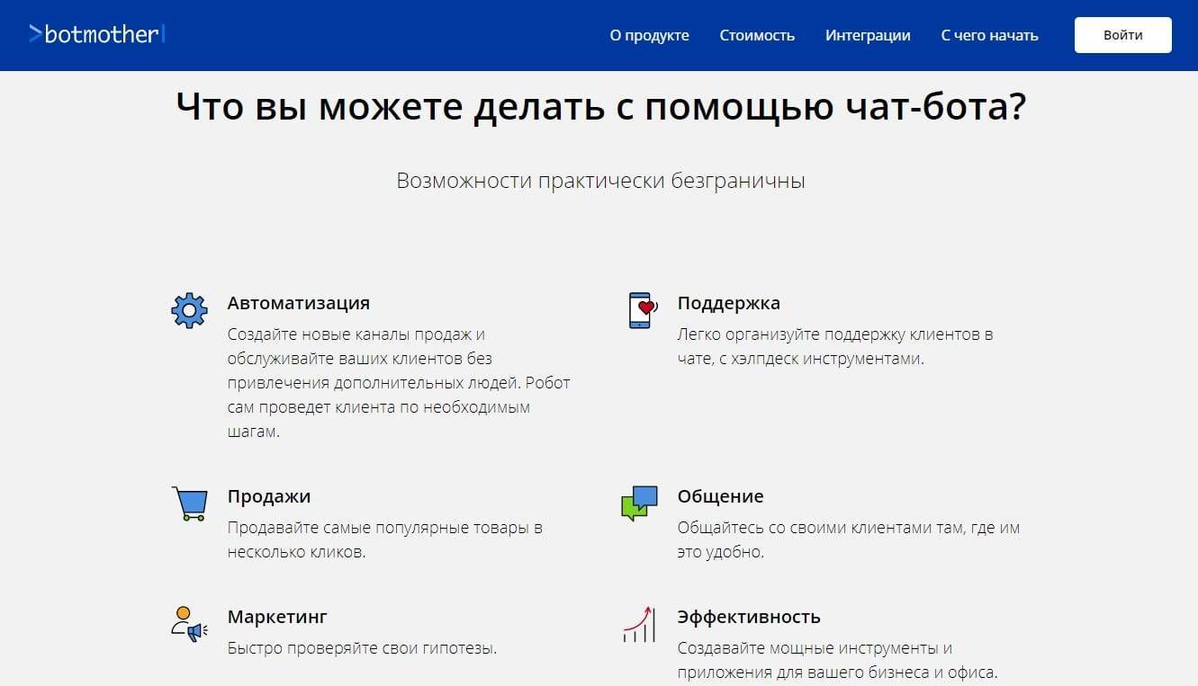 Также конструирует боты в Телеграмме и для всех популярных мессенджеров и социальных сетей. Собирается бот из простых блоков, а новичкам особенно помогут готовые шаблоны. Botmother способен не только поддерживать диалог и показывать статистику. С ботом можно провести оплату, даже если вы не ИП, сделать рассылку по имеющимся диалогом с новинками или акцией. Бот также способен интегрироваться с вашей CRM. Пробный бот создается бесплатно, а последующие — за 1249 рублей в месяц.
