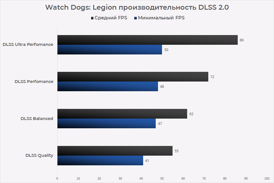 Ultra Performance в среднем даёт 86 FPS и 66 FPS на нижнем 1%. Это неплохой прирост по сравнению с режимом производительности, но уменьшение качества изображения делает его использование неоправданным.