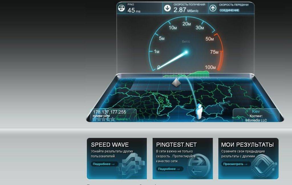 SpeedTest — еще один простой бесплатный сервис для этой цели. Чтобы начать проверку, достаточно нажать кнопку «Старт». Результат отобразится на экране через пару минут.
