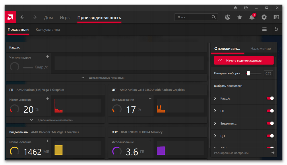 У видеокарт и процессоров со встроенной графикой от AMD есть свое прикладное ПО, которое следит за актуальностью драйверов и обладает другими полезными возможностями. Radeon Software мониторит состояние сразу нескольких компонентов системы – центрального, графического процессора, ОЗУ и видеопамяти, причем можно выбирать интервал опроса показателей производительности и при необходимости отключать лишние счетчики, например, чтобы видеть только кадровую частоту.