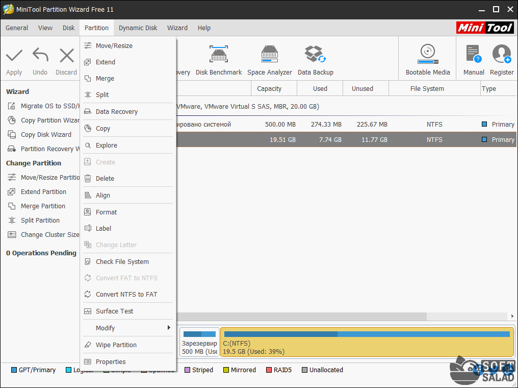 Заключительная в нашей подборке утилита отнюдь не является последней с точки зрения качества и функциональности. Напротив, MiniTool Partition Wizard способна конкурировать с более популярными разработками вроде Aomei Partition Assistant. Любовь продвинутых пользователей обусловлена интерфейсом, полностью переведенным на русский язык, и наличием всех необходимых опций.