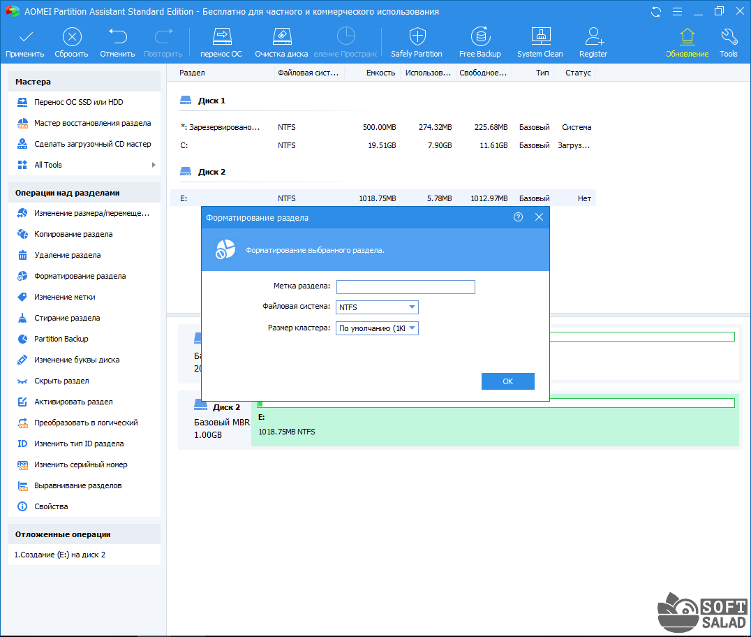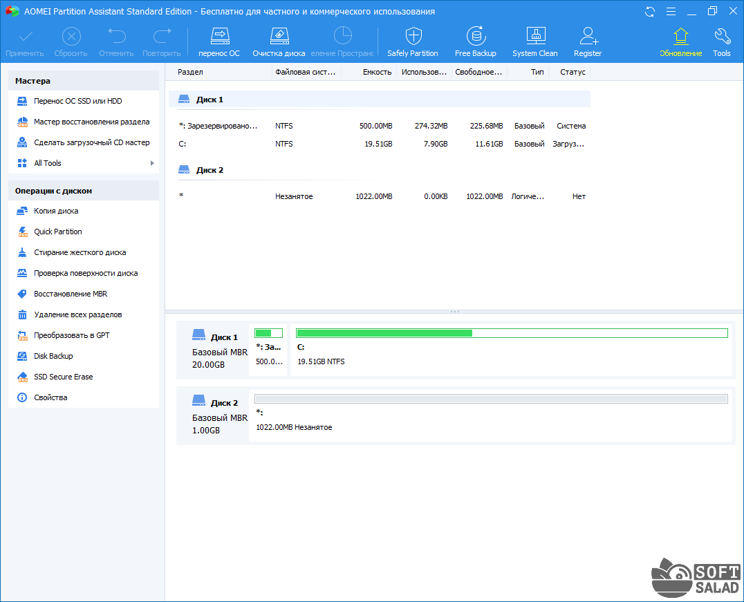 AOMEI Partition Assistant – простой и функциональный менеджер дисков, который может не только разделить диск или объединить разделы, но и выполнить множество прочих востребованных операций: копирование диска, клонирование раздела, конвертер NTFS в FAT, преобразования диска из MBR в GPT, перенос ОС с одного диска на другой.
