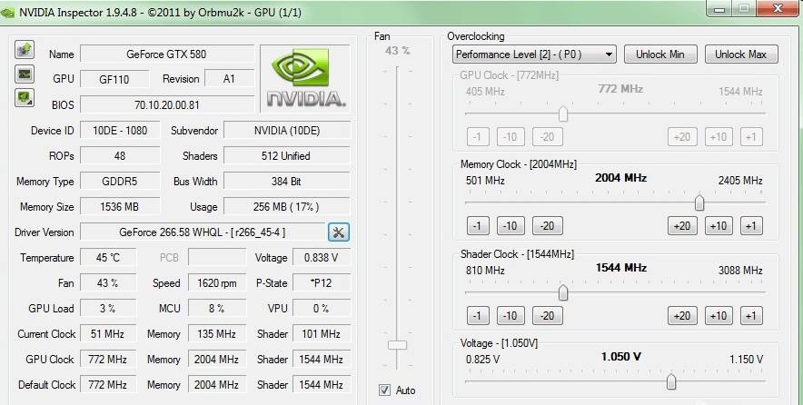 Но в отличие от ГПУ-Зет, NVIDIA Inspector предлагает легкую корректировку в работе видеоадаптера. На картинке демонстрируется, что с помощью утилиты можно настроить частоту процессора, частоту память и напряжение. Но необходимо самостоятельно следить за температурой, чтобы компоненты не перегревались и стабильно работали.