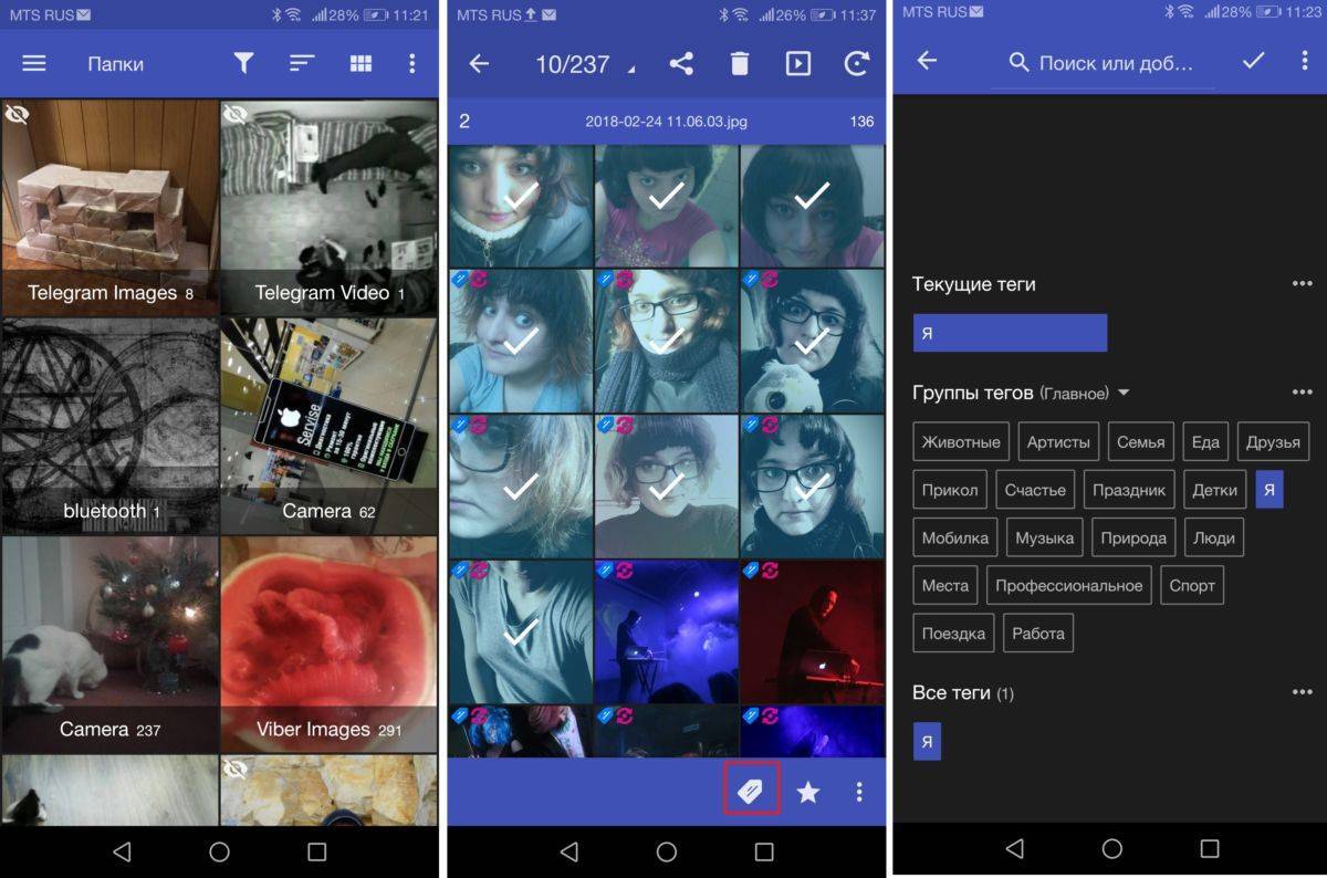 Открываем нужный альбом и начинаем сортировку. Для этого выбираем долгим нажатием все файлы с определенным содержанием — например, вашим лицом, и нажимаем на кнопку с изображение ярлыка внизу. Это позволит снабдить наши фото тэгами — метками, которе указывают на их содержание. Доступен целый список готовых тэгов на все случаи жизни («дети», «животные», «я», «работа» и так далее), а также можно добавлять свои. Выбираем нужную нам метку (к примеру, «Я») и нажимаем Готово.