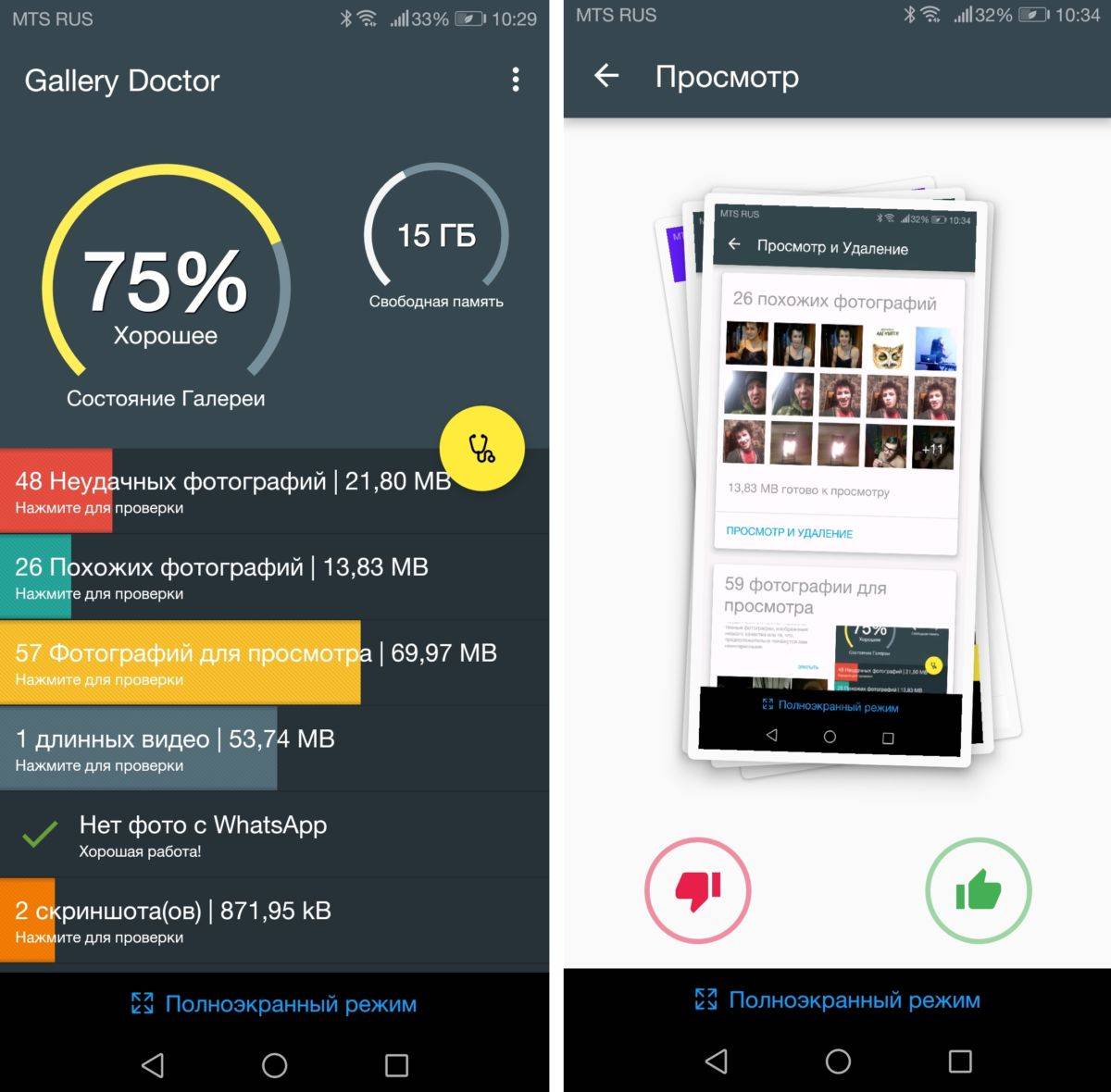 Установите Gallery Doctor по нашей ссылке, запустите сканирование и посмотрите на свой бардак, так сказать, наглядно. Приложение найдет похожие фото, длинные видео, скриншоты, слишком темные и смазанные фото, а также предложит вам просмотреть всю фотогалерею, чтобы удалить или сохранить фотографии, которые вам нужны или не нужны — для этого просто проводите пальцем влево или вправо: