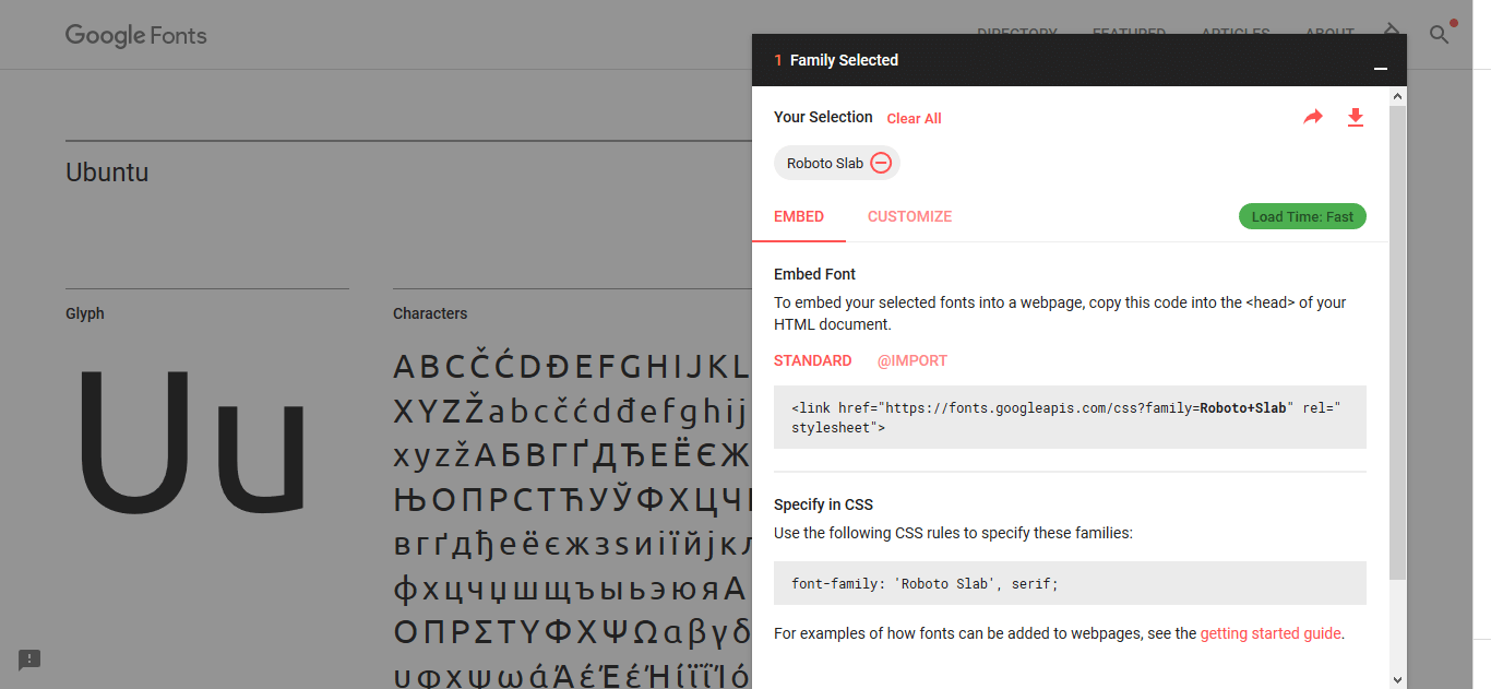 Если вы хотите скачать все начертания семейства или выбрать поддержку отдельных языков, нажмите Customize и поставьте галочки напротив нужных опций. В отдельном окне скачайте шрифт на компьютер или скопируйте ссылку для вставки на сайт.