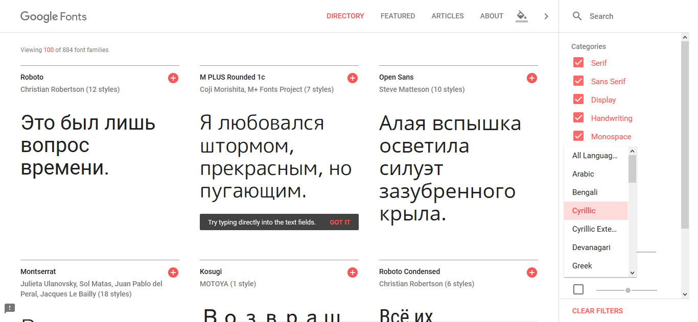 Чтобы найти необходимую гарнитуру, используйте фильтры. Вы можете посмотреть только моноширинные или только кириллические шрифты, найти семейства с определенным количеством начертаний.