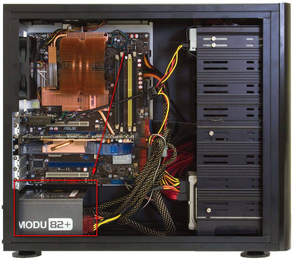 Откройте крышку компьютера и отключите блок питания от корпуса;