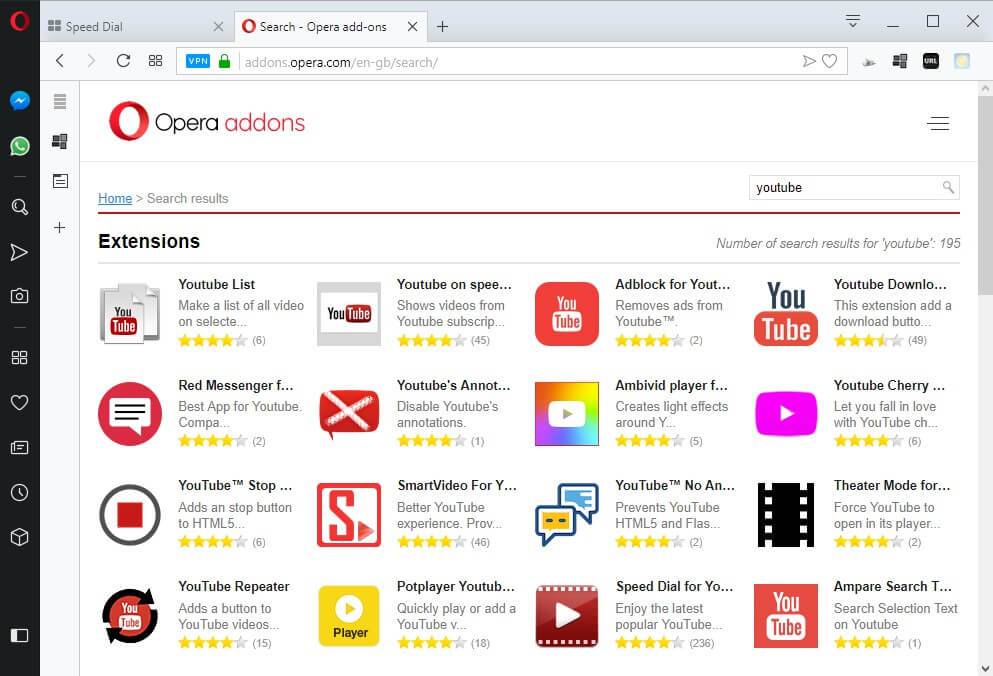 При вводе ключевого слова «YouTube» в поле поиска аддона Opera будет найдено 195 расширений для YT из собственной библиотеки расширений браузера. Тем не менее, пользователи также могут добавлять видео расширения Chrome в Opera, поскольку он основан на том же движке Chromium.