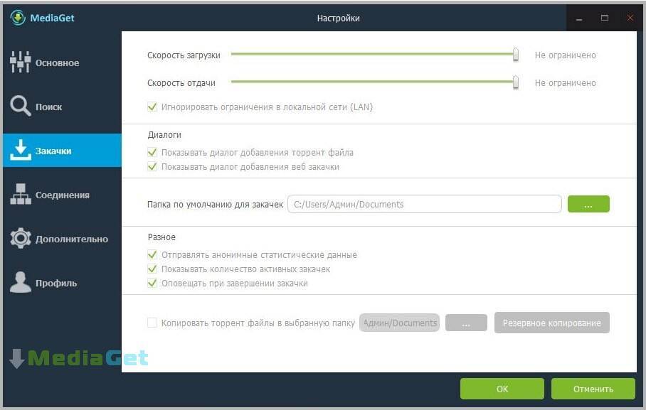 Скачав MediaGet на Windows 10 и Windows 11, вы получите уникальный функционал, который позволяет полностью контролировать процессы загрузки, раздачи и источники трафика. В настройках можно указать торрент-трекеры, с которых можно брать файлы, и настроить скорость загрузки и раздачи.