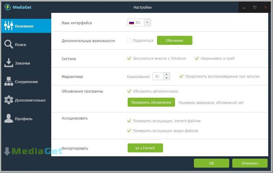 В настройках можно указать язык интерфейса (набор доступных файлов при этом тоже изменится), режим обучения, вы можете обозначить необходимость запуска при запуске ПК, проверку обновлений, импорт данных из другого торрент-клиента. Можно выбрать трекеры и время запроса к ним для поиска необходимых файлов и многое другое.