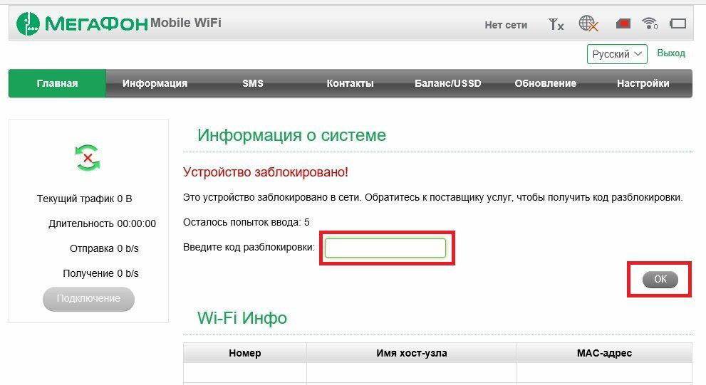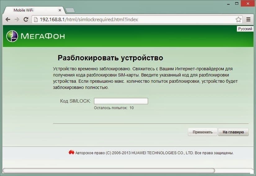 Разблокировка Мегафон MR100-3 (Huawei E5372) – эта функция предусмотренная производителем устройства, обеспечивающая возможность работы с SIM-картами любых операторов. При установке в MR100-3 SIM-карты другого оператора, например, Билайн или МТС, на передней панели самого устройства высветится надпись “Заблокировано“, а в Web-интерфейсе или в программе для соединения с интернет появится запрос для ввода кода разблокировки: