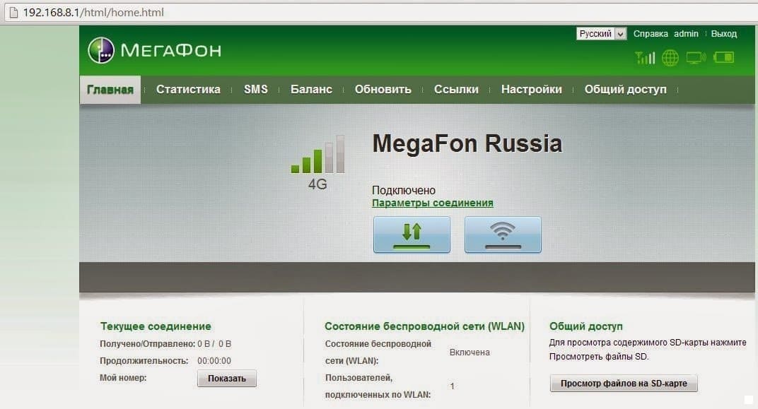 К ПК устройство можно подключить либо USB шнурком. IP-адрес web-интерфейса устройства по-умолчанию – 192.168.8.1, логин / пароль – admin / admin соответственно. Скриншот Web-интерфейса:
