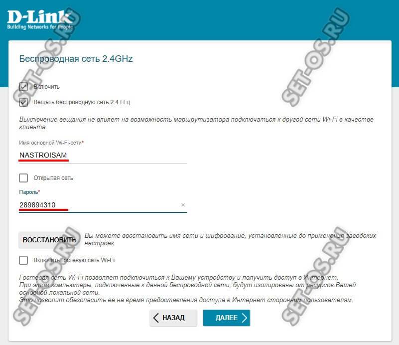 Далее необходимо дать имя сети и пароль для подключения. Это нужно для ее идентификации при попытке подключения мобильных устройств и защиты от несанкционированного доступа.