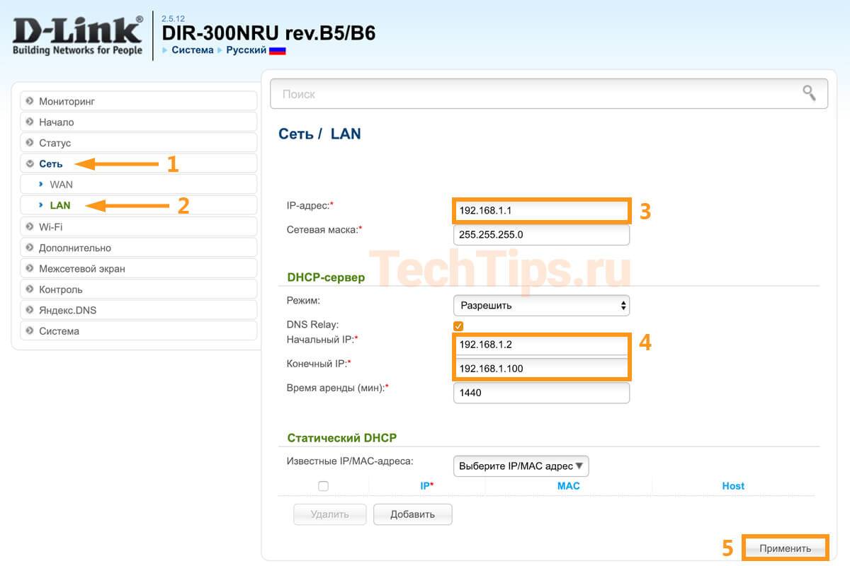 Часто они совпадают. У DIR-300, как и у большинства роутеров D-Link, стандартные адреса 192.168.0.1. Если у первого такой же, то в настройках DIR-300 его нужно изменить, чтобы не возникло конфликта между ними. Зайдите в «Сеть» – «LAN». В поле IP-адрес замените 0 на 1, получится 192.168.1.1. В DHCP сервере аналогично — «Начальный IP» на 192.168.1.2, «Конечный IP» на 192.168.1.100. Нажмите «Применить».