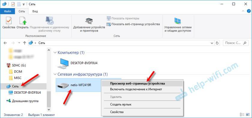 Иногда бывает, что мастера во время настройки изменяют IP-адрес роутера. В таком случае, попробуйте открыть проводник (Мой компьютер) и на вкладке сеть нажать правой кнопкой мыши на свой роутер. В меню выбрать “Просмотр веб-страницы устройства”.