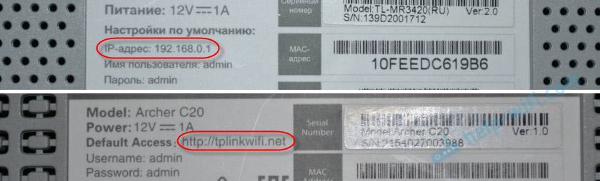 Необходимо убедится, что мы пытаемся открыть настройки роутера по правильному адресу. В большинстве случаев, заводской адрес для доступа к панели управления указан на самом роутере. Там скорее всего будет указан IP-адрес 192.168.1.1, 192.168.0.1, или адрес из букв. Например, tplinkwifi.net. Выглядит это следующим образом: