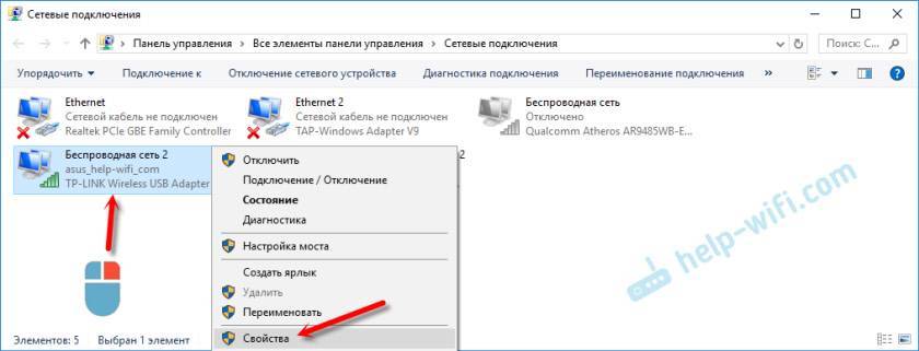 Дальше, в зависимости от того, по кабелю, или по Wi-Fi у вас подключен маршрутизатор, нажимаем правой кнопкой мыши на “Подключение по локальной сети” (в Windows 10 – Ethernet), или “Беспроводная сеть” и выбираем “Свойства”. Например, у меня подключение по Wi-Fi.
