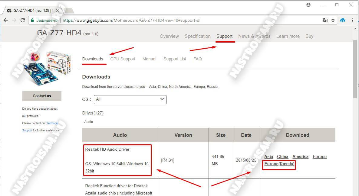 Классический способ, который используется «испокон веков» для установки драйверов продвинутыми пользователями и системными администраторами. Если не работает звук после установки Windows, Вам нужно зайти на сайт производителя звуковой карты . Если адаптер интегрированный, то на сайт производителя материнской платы. В случае с ноутбуком — на сайт производителя ноутбук. Там должен быть раздел «Поддержка» (Support) , «Драйвера и Утилиты» или нечто подобное. Откройте его чтобы найти и скачать последнюю версию программного обеспечения на звук. Искать нужно по модели устройства. У ноутбука она написана на корпусе, у материнской платы — прямо на самой плате. Как вариант, можно воспользоваться утилитами типа Aida64 или HWiNFO.