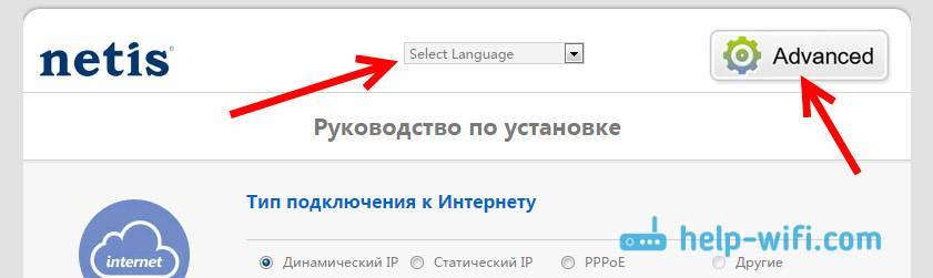 Нужно зайти в настройки роутера. Для этого откройте любой браузер, и перейдите по адресу 192.168.1.1, или http://netis.cc. Можете посмотреть эту подробную инструкцию. Если появится запрос логина и пароля, то укажите их. По умолчанию запрос не появляется, только если вы установили пароль на защиту настроек. Откроется панель управления. Если она у вас на английском, то смените язык, и нажмите на кнопку Advanced.