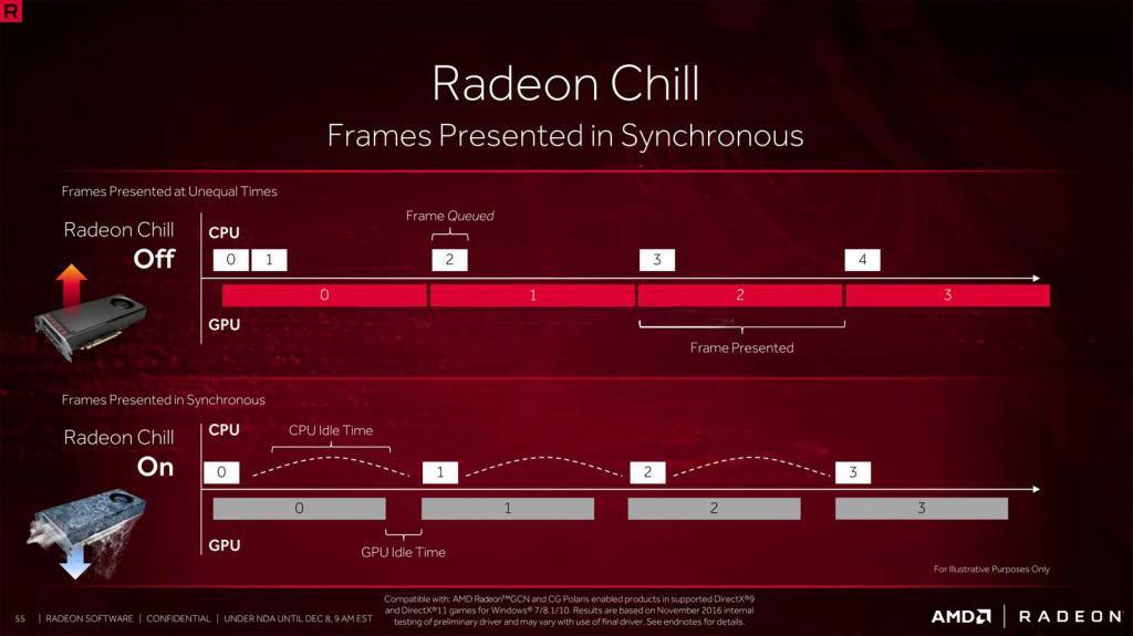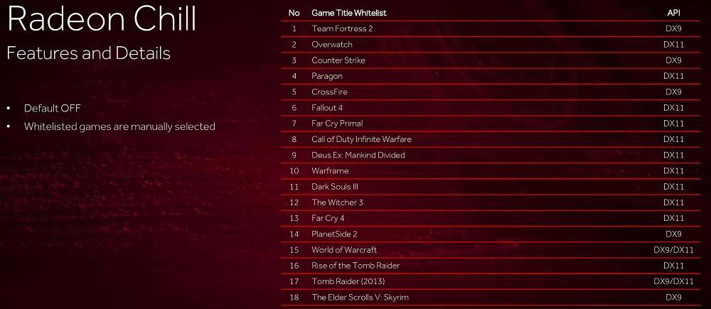 Интересно, что утилита с точно таким же названием была выпущена компанией HiAlgo, а в 2016 году этот малоизвестный производитель графического ПО был приобретён AMD. Продукт начали модернизировать, и если HiAlgo Chill ориентировался только на игры, использующие DirectX 9, то функция Radeon Chill может использоваться во всех продуктах с применением DirectX 9-12 и Vulkan API.