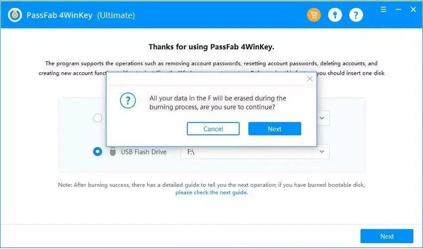 В главном интерфейсе нажмите кнопку «Далее». Теперь инструмент проверит вставленный диск и предупредит вас о наличии каких-либо данных, хранящихся на нем ранее, которые будут удалены, когда диск станет загрузочным. Безопасно удалите данные, если они важны, или продолжайте процесс.