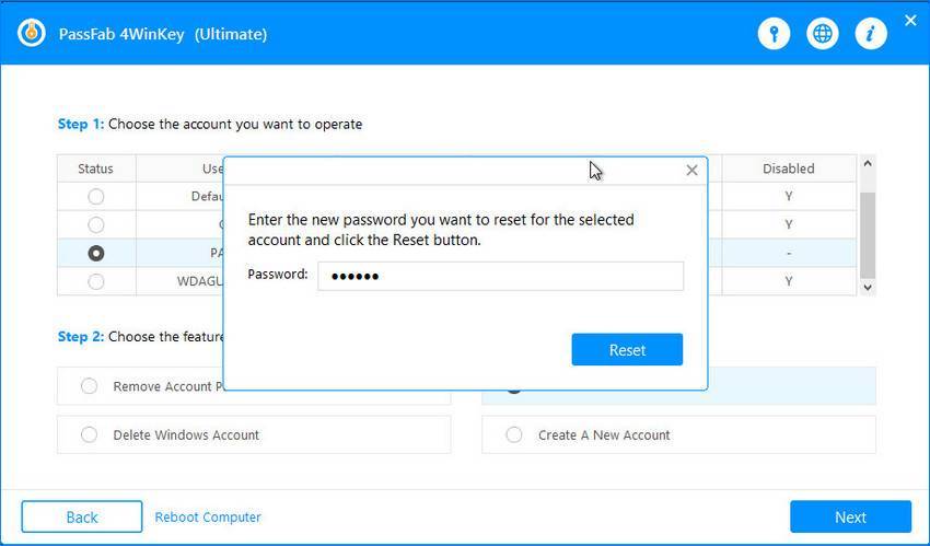 - Now, click on the account type as admin, guest or Microsoft by verifying the account name against it. Tap “Next” after that. This will reset the Windows 7 computer password and unlock it as well.