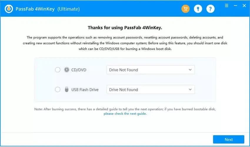 Шаг 1. Запишите PassFab 4WinKey на любой носитель (USB, DVD, CD), открыв программу PassFab 4WinKey. Здесь мы используем USB.