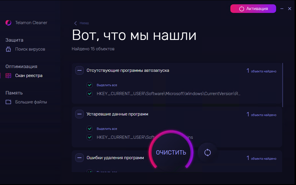 - Очистка реестра. Это основной пункт, для которого используются подобные программы, потому что предыдущие действия опытный пользователь может проделать самостоятельно вручную, чистить реестр самостоятельно не рекомендуется даже им. Дело в том, что любое действие пользователя, например установка и удаление программы, записывается в реестр, многие файлы там остаются и операционной системе сложнее находить нужные для работы файлы и обрабатывать их. Telamon Cleaner без труда находит ненужные файлы в реестре и удаляет их;