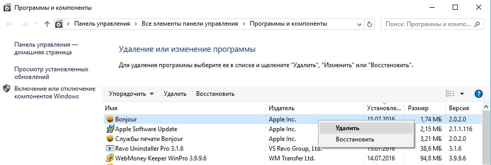 - В окне программы ПКМ по Bonjour → Удалить → подтвердите действие.