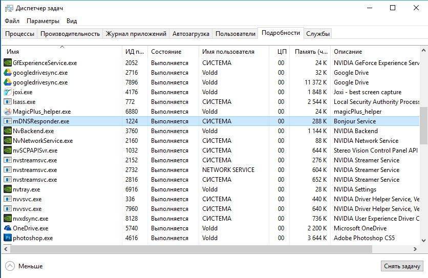 При инсталляции одного из вышеописанных приложений происходит фоновая установка Bonjour. Поскольку это ПО работает в фоновом режиме, его можно найти в Диспетчере задач, просмотрев вкладку Процессы (Windows 7) или Подробности (Windows 10) на наличие исполняемых задач: mDNSResponder.exe или mdnsNSP.dll.