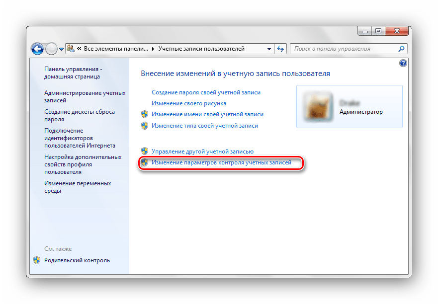 Перемещаемся в пункт под названием «Изменение параметров контроля учетных записей».