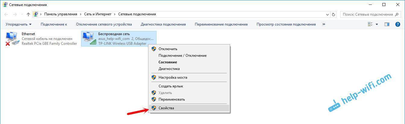 Дальше внимание! Нажмите правой кнопкой мыши на то подключение, через которое вы подключены к интернету, и выберите “Свойства”. Если у вас компьютер подключен по Wi-Fi, то это Беспроводное сетевое соединение (в Windows 10 — Беспроводная сеть). Если просто подключение по сетевому кабелю, то нажимаем на «Подключение по локальной сети» (или Ethernet в Windows 10)