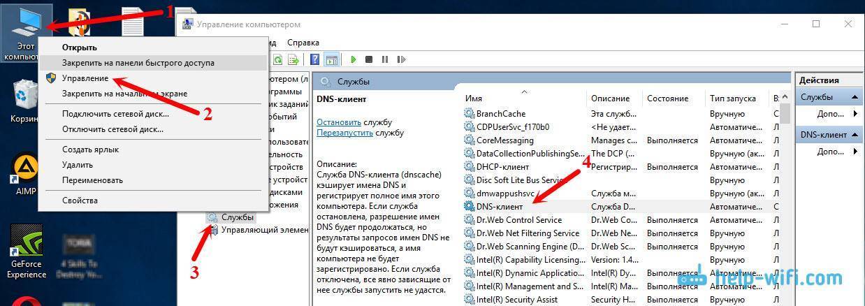 Нам нужно проверить, работает ли служба “DNS-клиент”, и перезапустить ее. Для этого, нажмите правой кнопкой мыши на значок «Компьютер» (Этот компьютер), и выберите пункт «Управление». Или нажмите сочетание клавиш Win+R, и выполните команду compmgmt.msc.