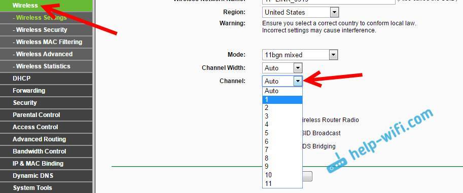 Нужно просто зайти в настройки роутера, перейти на вкладку где настраивается беспроводная сеть, и в пункте Канал (Channel) сменить канал. Вот так это выглядит на роутерах компании Tp-Link: