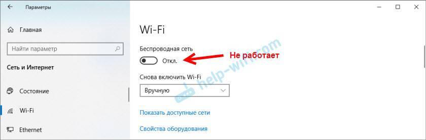 В Windows 10 могут быть проблемы с переключателем Wi-Fi в параметрах. Либо вообще нет раздела Wi-Fi в параметрах, либо переключатель неактивный (сам возвращается в положение “Выкл.”).